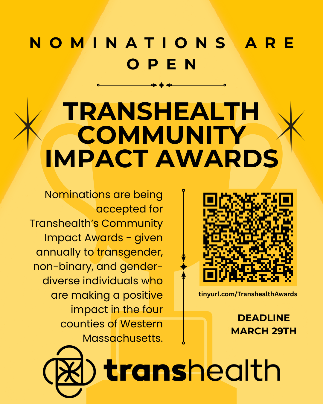 Introducing Transhealth’s Community Impact Awards–given to transgender, non-binary, and gender-diverse individuals who are making a positive impact in our local communities. Each year, we will present four Community Impact Awards, one for a person living and/or working in each of the four Western Massachusetts counties (Berkshire, Franklin, Hampden, and Hampshire).